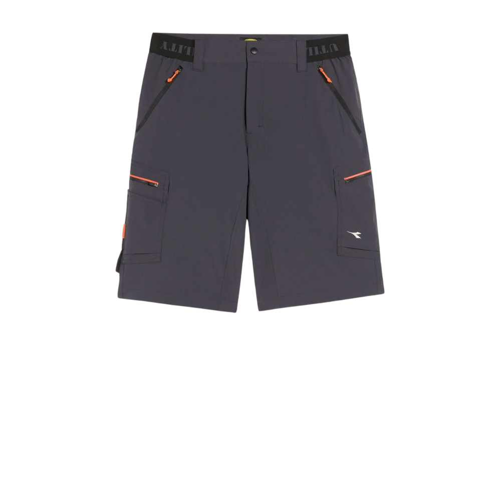 Bermuda en nylon stretch avec taille élastiquée et griffe Utility. Gousset sur l’entrejambe pour faciliter le mouvement. Deux poches avec fermeture zippée sur le devant et deux poches arrière avec velcro®. Deux poches cargo latérales avec glissière et détails fluo dont une multi-accessoires avec porte-mètre et porte-marteau avec boucle. Traitement Wicking 3M™ Scotchgard™ pour un séchage rapide.