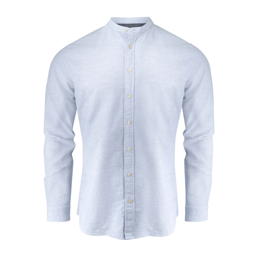 Chemise en coton/lin mélangé, col Mao et manchettes ajustables. Boutons aspect nacré. Tissu contrasté à l'intérieur du col et des poignets.