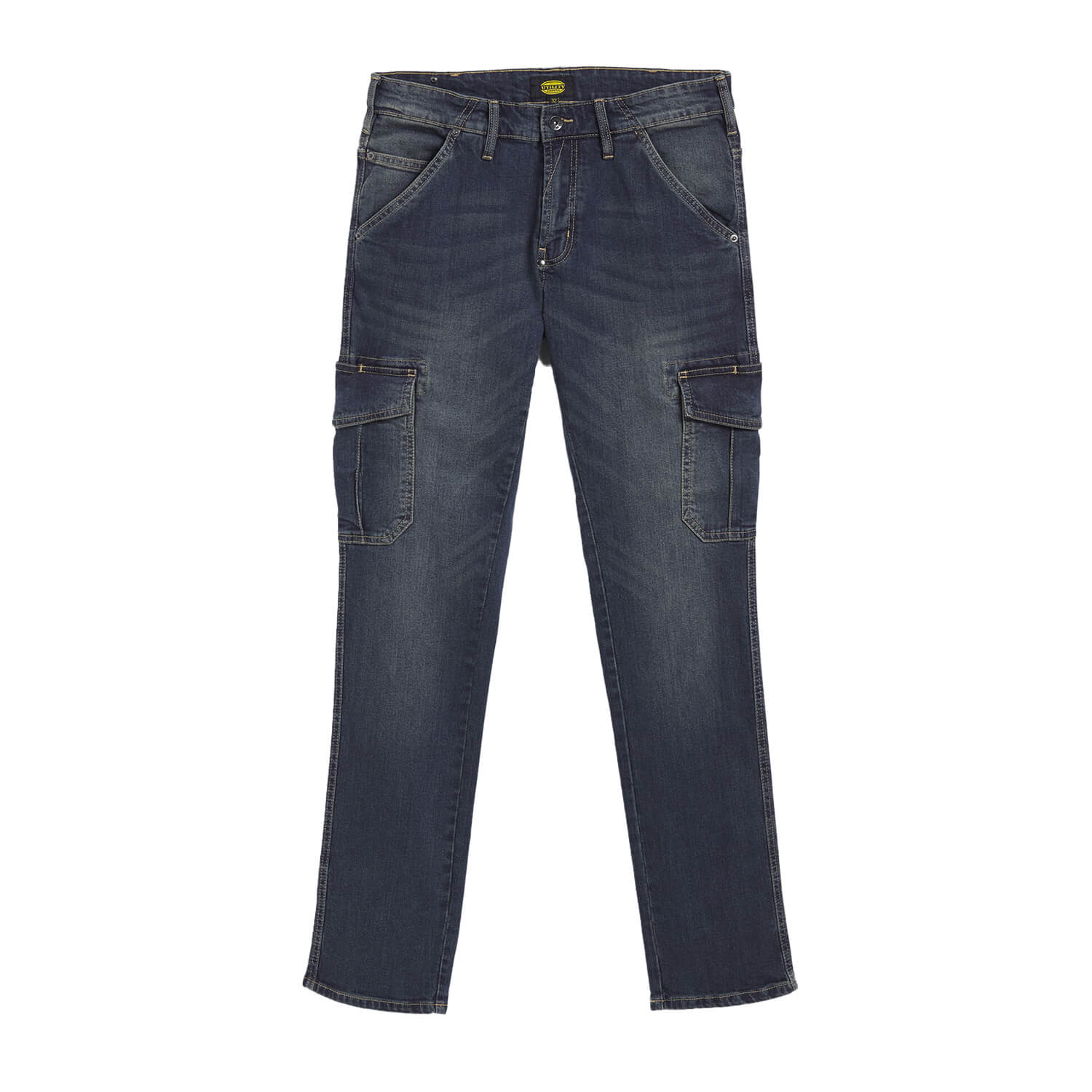 Denim cargo stone washed élastique. Traitements et soin des détails typiques de la tradition italienne de fabrication des jeans. Grandes poches latérales avec porte-crayons.
