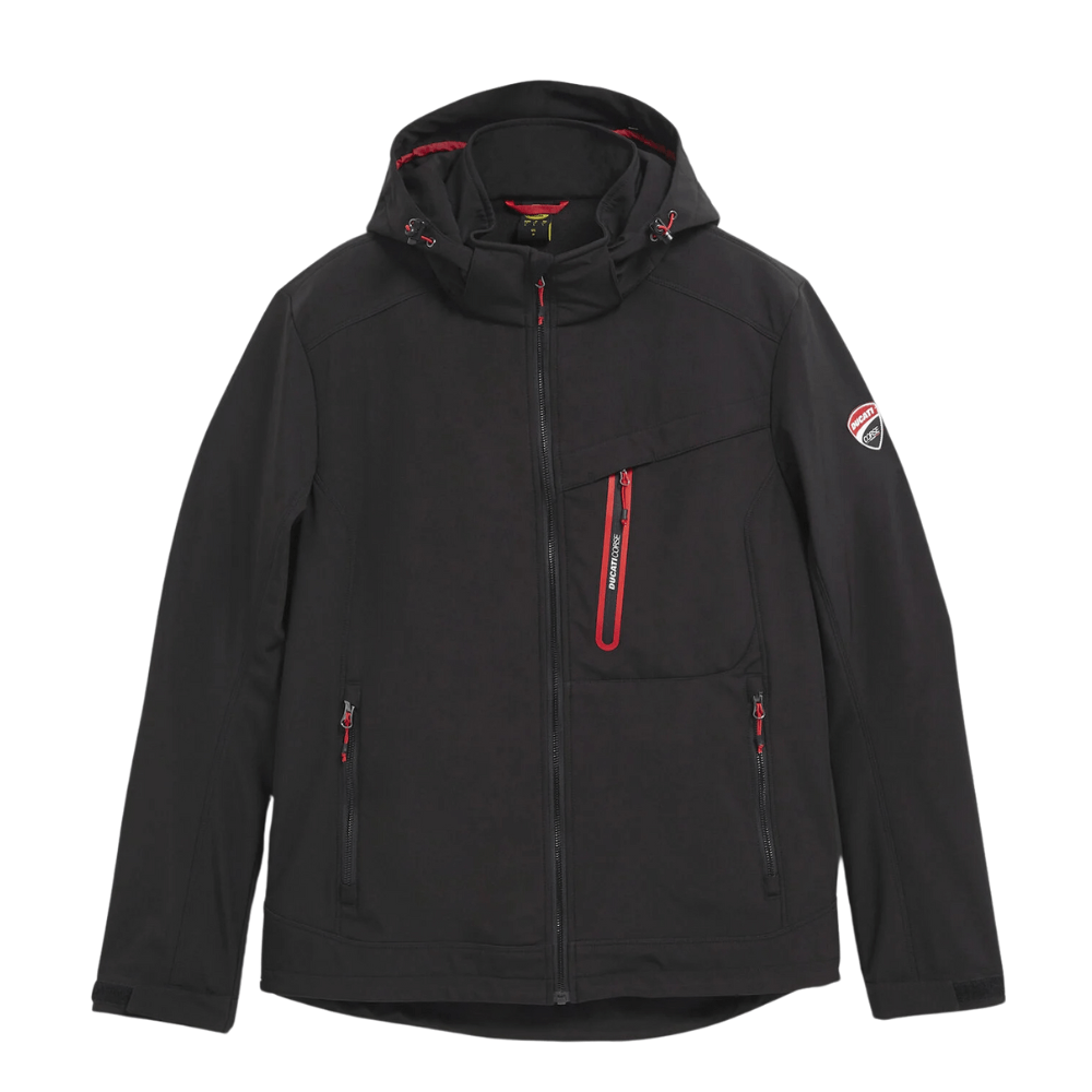 Veste softshell griffée DUCATI CORSE. Capuche détachable avec triple réglage, deux poches latérales et une à glissière sur le devant, poche intérieure avec velcro®. Dos allongé, pour une coupe plus seyante. Taille ajustable avec cordon de serrage. Manches ergonomiques avec poignets ajustables